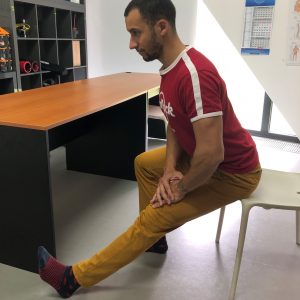 Sadnite si na okraj stoličky, jednu nohu oprite pätou o zem a do druhej, pokrčenej nohy sa zaprite. Špička vystretej nohy by mala smerovať čo najviac na Vás (kopnite si palcom do hlavy). S napriamenou chrbticou a spolu s výdychom sa ťahajte smerom vpred. Ťah by mal byť najmä na zadnej strane stehna, poprípade na lýtkach.