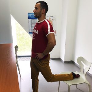 Oprite si nohu predkloneím na stoličku, ktorú si dáte za seba. Vyloženú nohu s výdychom ťahajte vzad a kolenom smerujte kolmo dole. S výdychom sa snažte ťahať zadnú nohu viac vzad a dole. Snažte sa udržať napriamenú chrbticu a neprehýbajte sa v driekovej časti chrbtice. Ťah by ste mali cítiť najmä na prednej strane stehna, v oblasti bedier.
