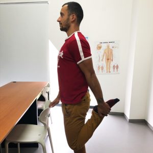 Chyťte si nohu v oblasti členku tak, aby ste sa čo najviac priblížili pätou zadku. Druhou rukou sa pre lepšiu stabilitu môžete oprieť o stoličku alebo stôl. S výdychom sa snažte ťahať koleno čo najviac dole a pätu ťahajte k zadku. Rovnako ako v predchádzajúcich cvičeniach sa sústreďte na napriamenú chrbticu a nehrbte sa. Ťah by ste mali cítiť najmä na prednej strane stehna.