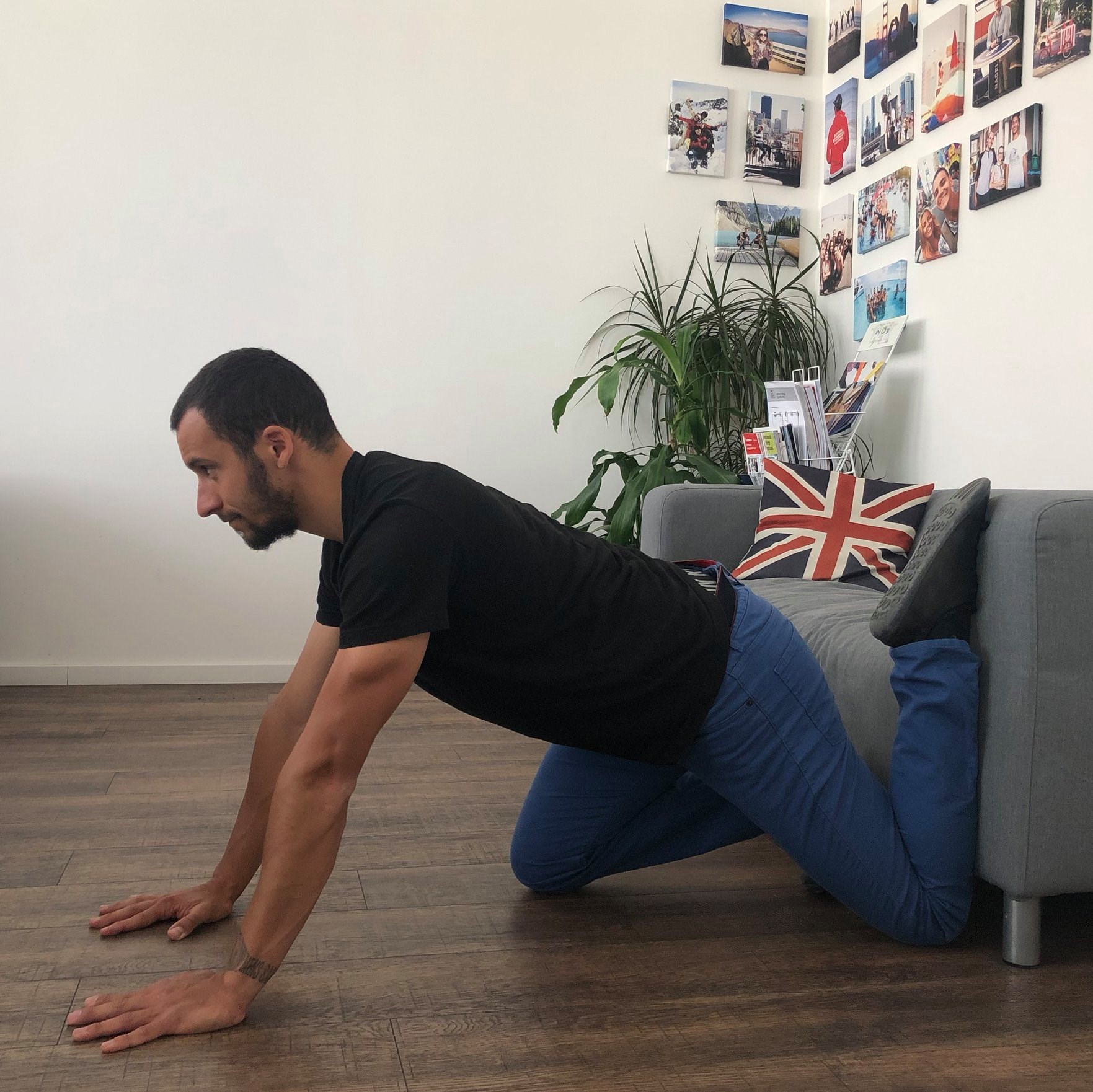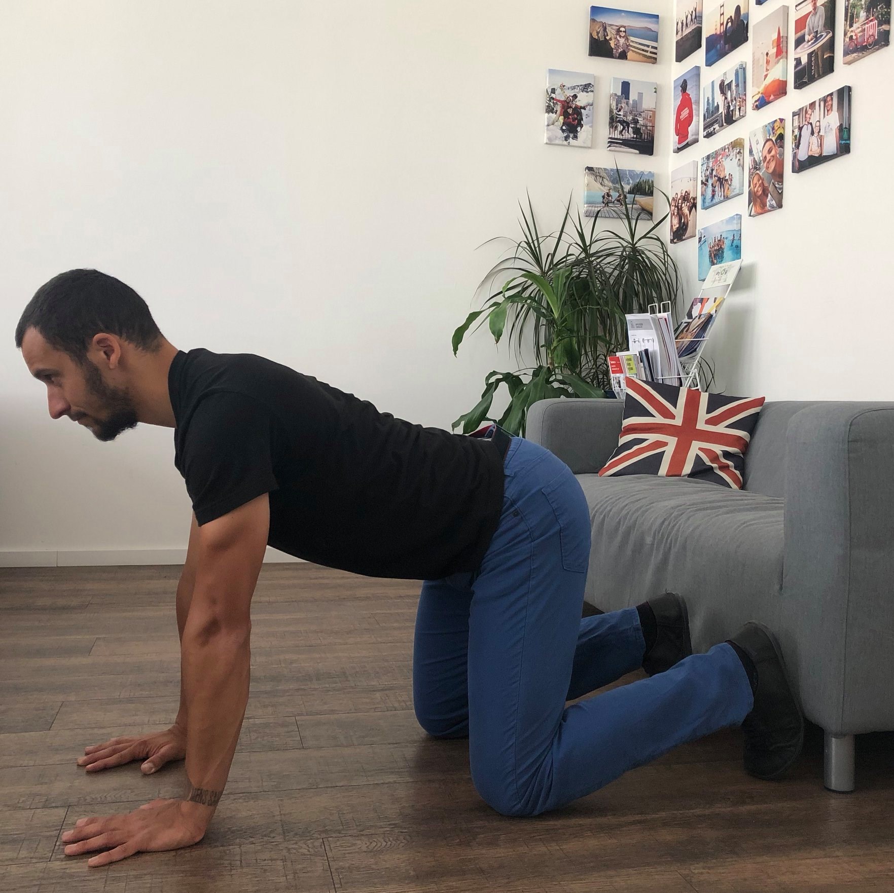 - Začnite na v pozícii na štyroch s rukami a kolenami na zemi.