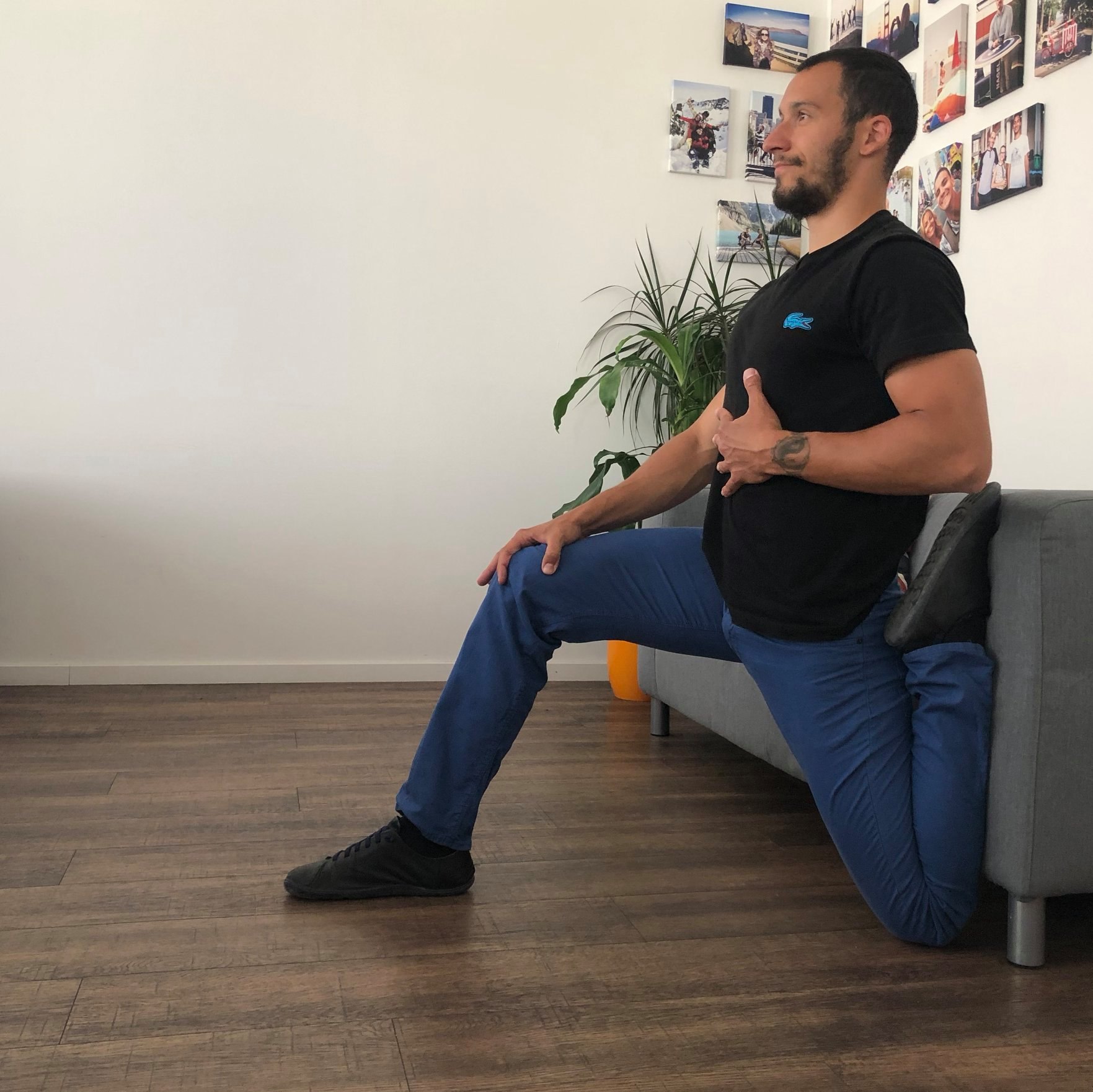 - Predkolenie na zadnej nohe by malo byť v kontakte so stenou (gaučom), päta sa dotýkať zadku a nemali by ste pociťovať extrémne napätie (bolesť).