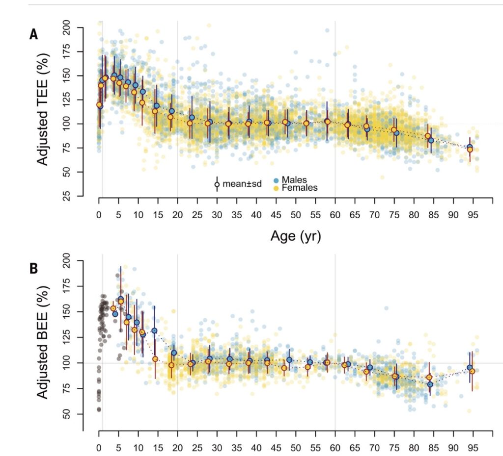 Z výsledkov tejto práce bolo, že celkový energetický výdaj (TEE) ako aj bazálny energetický výdaj (BEE) ,upravený o netukovú hmotu, sa medzi 20 a 60 rokom života skoro vôbec nemení a tieto výsledky boli nezávislé na pohlaví.