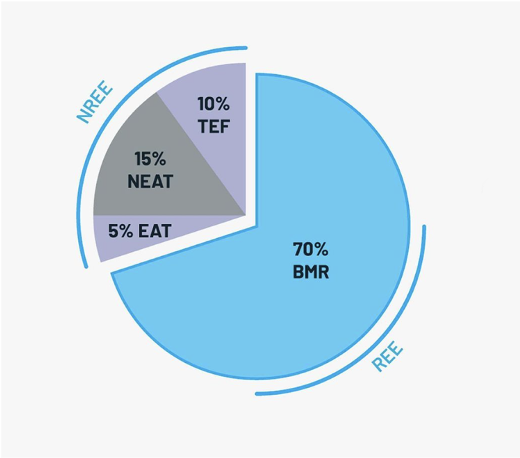 Najväčšiu časť a to zhruba 70% tvorí bazálny metabolizmus (BEE – basal energy expendure, BMR – basal metabolic rate), potom cca 15% “metabolizmus” netréningových aktivít (NEAT – non-exericise activity thermogenesis), cca 10% termický efekt potravín (TEF – thermic effect of food) a iba 5% metabolizmus pohybových aktivít (EAT – exercise activity thermogenesis).